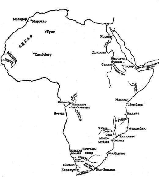 Тем временем португальцы добились успехов в Анголе. Впервые они попали туда в 1559 г., а пятнадцатью годами позже заложили поселок на берегу вблизи Лоанды. К концу столетия они уже очень крепко обосновались в Анголе и старались добраться до Бенгелы. Перенесение резиденции епископа из Сан-Сальвадора в Лоанду в самом начале XVIII в. еще более подняло значение Анголы, а в 1606 г. была сделана попытка открыть сообщение с Замбези.