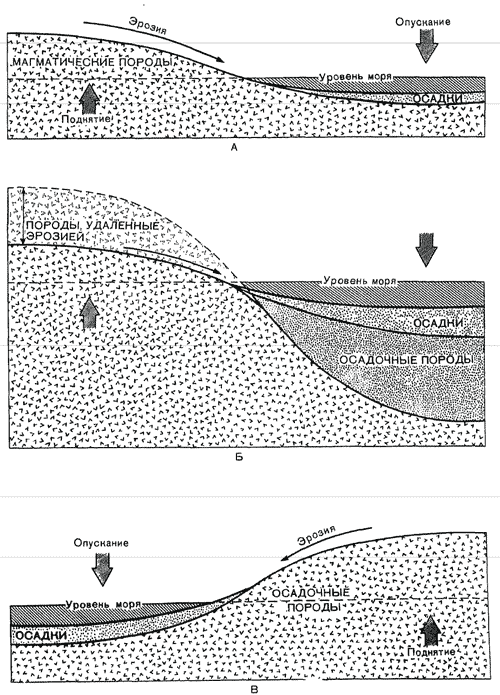 Хотя все осадки накапливаются на поверхности твердой оболочки Земли и превращение их в осадочные породы происходит на небольшой глубине, однако бурением и геофизическими исследованиями осадочные породы обнаружены глубоко в толще коры. Это позволяет предположить, что временами различные участки земной коры прогибаются, и вместе с ними вглубь Земли перемещаются и осадочные породы. Напротив, во многих частях континента магматические и метаморфические породы, в том числе и образованные на очень большой глубине, находятся на поверхности, и ими бывают сложены даже очень высокие горы. Это указывает на большие поднятия отдельных участков земной коры, вызывающие сильную эрозию. Таким образом, ясно, что части коры поднимаются и опускаются, хотя и очень медленно, и слагающие их породы, которые переносятся вверх или вниз и попадают в чуждые им условия, должны в силу этого подвергаться изменениям.