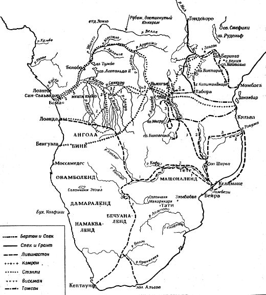 Как ни велики были успехи в деле продвижения в глубь Северной Африки в течение рассматриваемого периода, они не могут итти ни в какое сравнение с достижениями в области исследования Центральной Африки. Вся ее карта приняла к концу периода совершенно другой вид, а накопившийся материал произвел целую революцию в географических воззрениях на эту область земного шара.