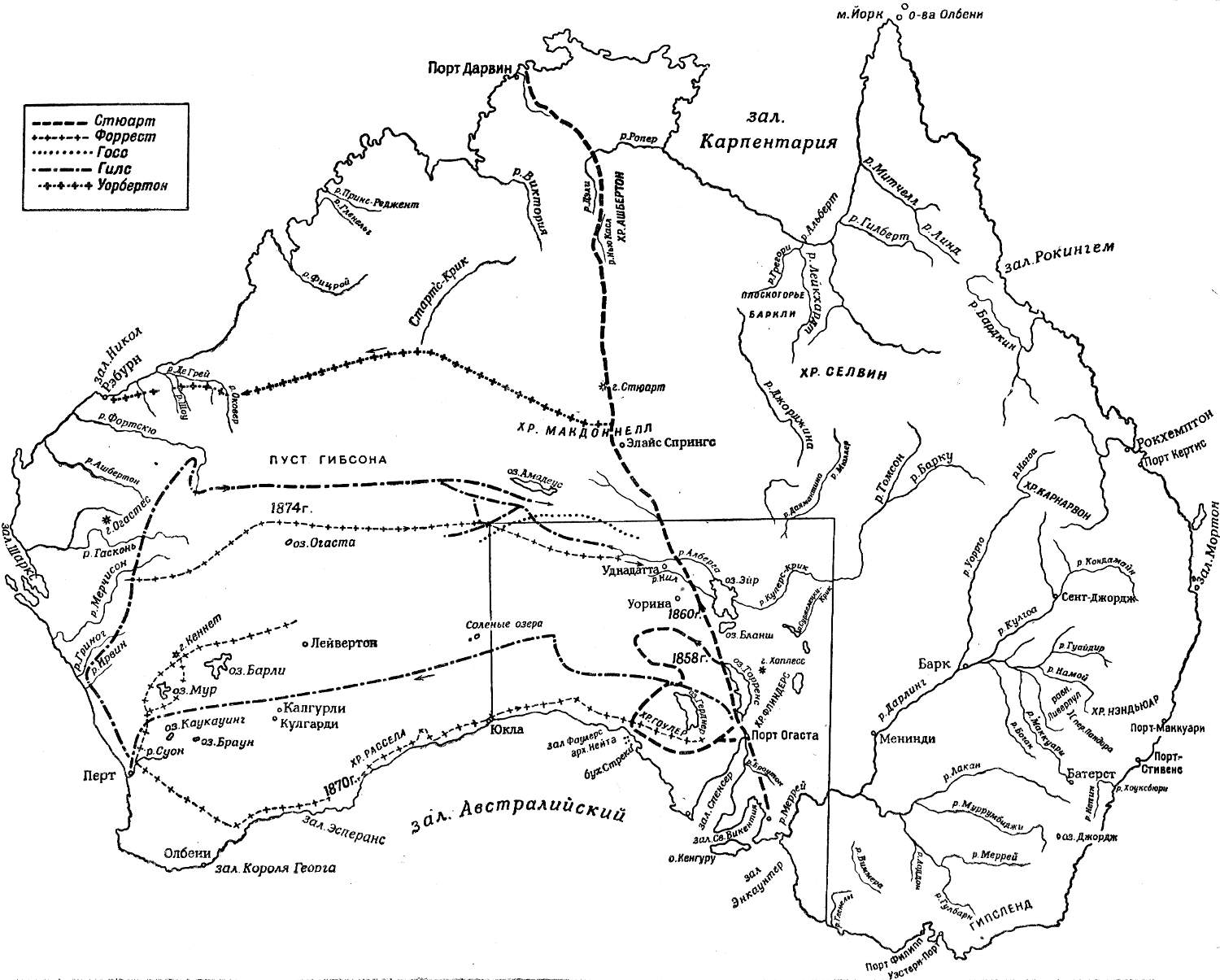 Первый значительный шаг вперед после Эйра сделал крупный ученый — путешественник Людвиг Лейкхардт. В 1844 г. он вышел с целью найти удобный путь от залива Мортон до Порт-Виктории. Последний был городком, основанным вблизи более старого, но к тому времени уже заброшенного поселка Порт-Эссингтона на северном побережье Австралии. 7 октября Лейкхардт достиг реки Кондамин и, следуя в северо-западном направлении, пересек водораздел, отделяющий ее от реки Доусон, вниз по течению которой он и прошел. Следуя все в том же северо-западном направлении, он пересек хребет Экспедиции и в феврале 1845 г. достиг южных притоков реки Бардкин. По долине этой реки Лейкхардт перевалил через лежащие в северном направлении горы, вышел к реке Линд и частью по ней, частью по реке Митчелл добрался к заливу Карпентария. Пройдя вдоль его южного берега и переправившись через ряд рек, в середине сентября Лейкхардт достиг Порт-Виктории. В Сидней он вернулся морем.