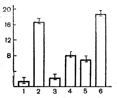 Рис. 20. Влияние ингибиторов обмена на поступление D-ксилозы в икроножные мышцы лягушки (Дорошенко, 1968). По оси ординат — внутриклеточная концентрация ксилозы, мМ; 1 — контроль; г — 2,4-динитрофенол (0,3 мМ); 3 — 2,4-динитрофенол (0,3 мМ) + флорицин (1 мМ); 4— азид натрия (16 мМ); 5 — моноиодоуксусная кислота (0,25 мМ); 6 — инсулин (0,5 ед/мл)