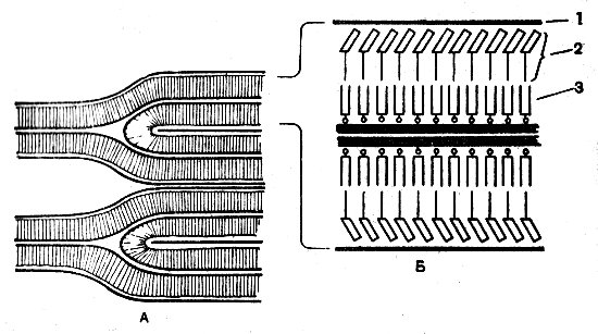 Рис. 35. Схема строения граны хлоропласта. А — две пластины граны; Б — расположение хлорофилла в пластине граны; 1 — слой белка; 2 — молекулы хлорофилла; 3 — слой липидов