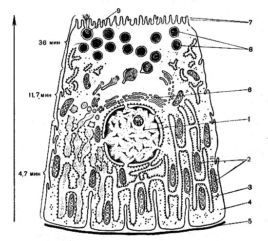 С помощью метода авторадиографии (способ фотографической регистрации излучения радиоактивных веществ в клетках) удалось определить длительность отдельных этапов секреторного цикла. Для этого крысам внутривенно вводили меченую аминокислоту 3Н-лейцин, которая использовалась клетками как исходный материал для построения зимогена. По продвижению включенной метки можно было судить о скорости процесса секреции. Лейцин проникает в клетку через базальную мембрану и в зоне эндоплазматической сети, где совершается синтез первичного секрета, задерживается на 4,7 мин. Образовавшийся секрет переходит в область комплекса Гольджи для дальнейшего формирования капель секрета, на что затрачивается 11,7 мин. Из области комплекса Гольджи капельки движутся к поверхности клетки, увеличиваясь в числе ,и плотности, окончательно «созревая». Этот этап требует 36 мин. Когда секреторная капелька достигает апикальной поверхности клетки, ее мембрана и поверхностная мембрана клетки сливаются и образуется открытая пора, через которую и выводится секрет наружу (мерокриновый тип выведения секрета). После выведения секрета наступает восстановительный период. Таким образом, для производства белкового секрета клетка затрачивает всего 52,4 мин. Наряду с выработкой зимогена эта ацинарная клетка синтезирует и структурные белки, которые остаются в клетке в течение 62,5 ч и за это время постепенно заменяются новыми.