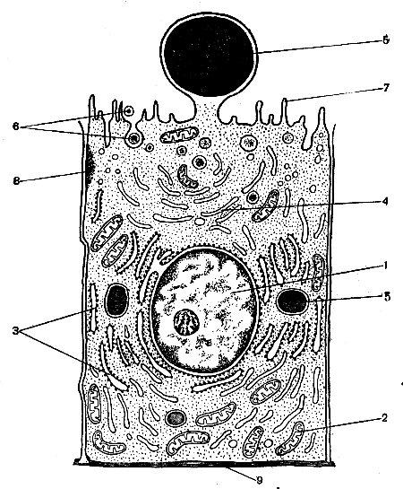 Рис. 37. Схема выделения секрета в секреторных клетках молочной железы (Bargmann a Knoop, 1959) с изменениями: 1 — ядро; 2 — митохондрия; 3 — эндоплазматическая сеть; 4 — комплекс Гольджи; б — жировые капли; 6 — белковые гранулы; 7 — микроворсинки; 8 — десмосомы; 9 — базальная мембрана.