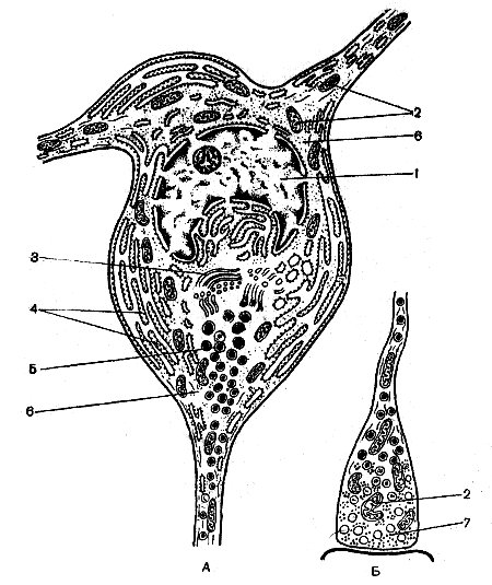 Рис. 38. Схема строения нейросекреторной клетки гипоталамуса. А — перикарион; Б — терминаль (окончание аксона); 1 — ядро; 2 — митохондрии; 3 — комплекс Гольджи; 4 — эндоплазматическая сеть; 5 — гранулы нейросекрета; 6 — свободные рибосомы; 7 — синаптические пузырьки