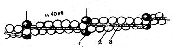 Рис. 49. Схема строения тонкой протофибриллы: 1 — тропонин; 2 — тропомиозин; 3 — актин