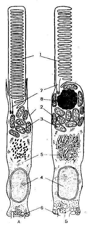 Рис. 52. Схема строения палочки (А) и колбочки (Б) (Говардский и Грибакин, 1975): 1 — наружный сегмент; 2 — внутренний сегмент; 3 — эллипсоид (скопление митохондрий); 4 — ядро; 5 — комплекс Гольджи; в — синаптическое тельце; 7 — цилия (соединительная ножка); 8 — масляная капля