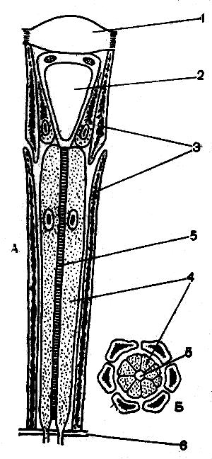 Рис. 53. Схема строения омматидия глаза пчелы (Мазохин — Поршняков, 1965). А — продольный разрез; Б —поперечный разрез; 1 — хрусталик; 2 — кристаллический конус; 3 — пигментные клетки; 4 — зрительные клетки; 5 — рабдом; 6 — базальная мембрана