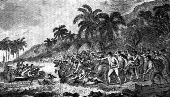 Кук выстрелил из своей двустволки, заряженной пулями, и убил одного из туземцев. За этим немедленно последовала атака камнями, на которую солдаты морской пехоты и матросы из шлюпок ответили ружейным огнем. «Островитяне,— говорит Кинг,— против всех ожиданий выдержали огонь с величайшей твердостью и, прежде чем солдаты морской пехоты перезарядили ружья, бросились на них со страшным криком. За этим последовала сцена крайнего ужаса и смятения.