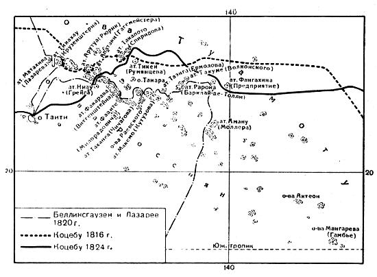 Маршруты Беллинсгаузена и Лазарева и Коцебу в архипелаге Туамоту Из «Атласа истории географических открытий и исследований». 1959 г.