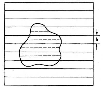 Рис. 11. Палетка, состоящая из системы параллельных линий. Площадь фигуры равна сумме длин отрезков (средних пунктирных), отсекаемых контуром участка, умноженной на расстояние между линиями палетки. P = р∑l