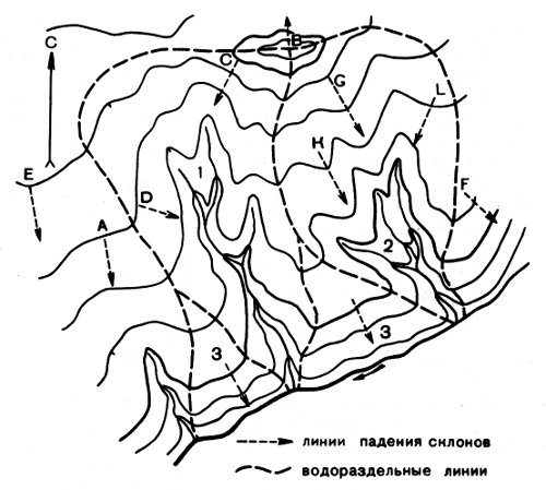 Рис. 38. Оконтурирование на карте бассейнов водотоков (1 и 2) и склона (3) к главной реке