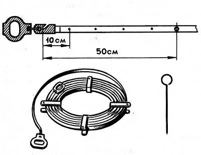 При непосредственных измерениях небольших расстояний пользуются тесьмяными или стальными рулетками. Прибором непосредственных линейных измерений средней точности служат также мерные ленты длиной 20 м. Это тонкие стальные ленты шириной 15—20 мм с делениями через 1 м; 0,5 м; 0,1 м. Началом счета служит штрих в прорези — крючке ленты (рис. 57). Для фиксирования концов ленты при укладке ее на грунт и счета количества укладок ленты в комплекс входят также 6 или 11 шпилек. Для контроля линии измеряют дважды, в прямом и обратном направлениях. Относительная погрешность измерения расстояний лентой около 1:2000 от длины линии. Точность измерения длин лентой зависит от правильности длины ленты, аккуратности лиц, ведущих измерения, а также от характера местности.