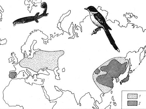 Для прерывистых ареалов характерны пространственные разрывы между различными частями — группами популяций, отражающие историю вида. Изменения климата в плейстоцене, сопровождавшиеся общим похолоданием, усилением суровости зим, уменьшением влажности, наиболее резко повлияли на глубинные районы Евразии, особенно на Восточную Сибирь. Здесь происходило вымирание популяций многих видов растений и животных, которое распространялось затем на всю Сибирь, а иногда и на Русскую равнину. Наступление ледников явилось основной причиной разрыва ареалов голубой сороки и вьюна (рис. 2.2), растения кислички (рис. 2.3). Теплолюбивые формы, вымершие на больших пространствах Евразии, сохранились в Средиземноморье, на Кавказе, на территории Дальнего Востока.