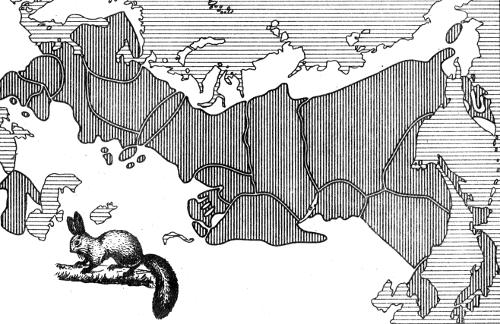На рис. 2.4 показаны хорошо различимые границы подвидов белки на территории Евразии. Подвид, населяющий Кольский полуостров и Карелию, отличается частой встречаемостью краснохвостых и красноухих животных. Для белок на Украине характерно интенсивное развитие зимней коричневой окраски. Карпатские белки почти все чернохвостые и черноспинные. У якутских белок зимний мех серый, без рыжих тонов. Вообще в направлении с запада на восток увеличиваются размеры зверьков; окраска зимнего меха переходит от коричневатой к пепельно-серой и даже темной. Границы между подвидами выражены, как правило, вполне отчетливо, и их ареалы не перекрываются. Следовательно, данные подвиды являются аллопатрическими (от греч. allos — другой, patris — родина).