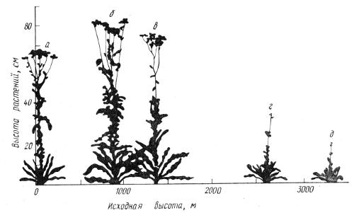 Рис. 2.6. Экотипическая дифференцировка в популяциях тысячелистника Achillea millifolium (по J. Clausen et al., 1948). Растения из мест, расположенных на разной высоте (а—д), выращивали на одном участке (высота 90 м)
