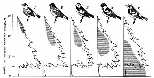 Принцип конкурентного исключения получил многочисленные подтверждения при исследовании природных и искусственных сообществ. Рассмотрим несколько примеров. При изучении использования пространства в популяциях пяти симпатрических видов американских славок установлено, что особи каждого вида отличаются своим специфическим характером использования разных частей деревьев хвойного леса (рис. 2.13). Они также неодинаковыми способами ведут поиск насекомых среди веток и хвои.