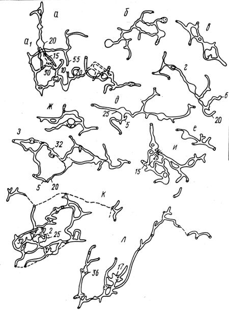 Рис. 2.14. Топография гнездовых нор на семейном участке обыкновенной полевки Microtus arvalis (по Н.В. Башениной, 1977): буквами обозначены разные типы нор, цифрами — их глубина, см