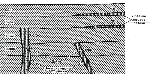 Чтобы увидеть этот принцип в действии, рассмотрим рис. 9, на котором показана последовательность осадочных пластов. Принадлежность их к определенным системам устанавливается по содержащимся в них ископаемым, поэтому они поименованы в соответствии с геохронологической шкалой. Между верхними пластами залегают два древних лавовых потока; в нижних пластах имеются две дайки (рис. 5), представляющие результат интрузий магмы. Возраст этих даек по радиометрическим определениям составляет соответственно 250 и 210 миллионов лет. Во время затвердевания магмы, послужившей исходным материалом для образования этих даек, осадочные пласты в узкой зоне соприкосновения с магмой «спеклись» и подверглись химическим изменениям в результате воздействия горячей магмы, Однако измененная зона отсутствует на верхней поверхности даек. Это означает, что во время образования интрузии и затвердевания магмы слой, который сейчас перекрывает дайку, еще не образовался. В противном случае, он также подвергся бы изменениям под действием тепла и химических реакций. Поэтому поверхности раздела, к которым приурочены кровли обеих даек, должны быть результатами двух длительных периодов, в течение которых эрозия уничтожила слои, некогда залегавшие выше современных поверхностей раздела. Следовательно, эти поверхности, подобно поверхности (П) на рис. 8, являются поверхностями несогласия. Учитывая радиометрические датировки этих двух даек, можно видеть, что триасовый пласт, который моложе одной из даек, но старше другой, должен иметь возраст менее чем 250, но более чем 210 миллионов лет. Вычитая одну цифру из другой, получаем 40 миллионов лет – максимальную продолжительность триасового периода, определенную для этого частного случая.