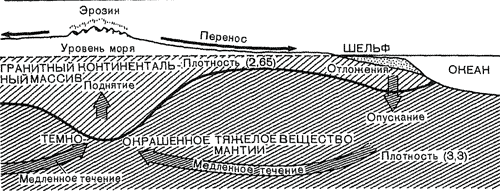 Рис. 19. Гранитные континенты, плавающие на более тяжелом веществе мантии. Толщина континентов больше всего на участках наибольшего поднятия их поверхности. При размыве высокогорных массивов давление на подстилающее их тяжелое вещество ослабевает. Продукты размыва переносятся на континентальные шельфы, создавая на них добавочную нагрузку, что вызывает погружение и вытеснение вещества мантии в стороны. Это вещество медленно перетекает в области меньшего давления, соответствующие областям разрушенных гор. В результате происходит новое поднятие, «обновляющее» горы.