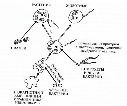 Рис. 5.3. Одна из схем возможных основных последовательных этапов симбиогенеза при возникновении главных групп живых существ (по А.Л. Тахтаджяну, 1972)