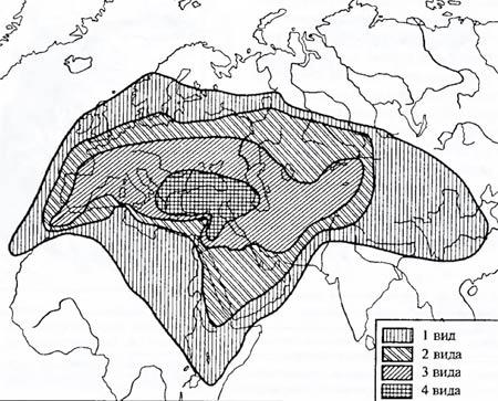 Рис.6.11. Ареал рода коровяков (Verbascum). Плотность штриховки пропорциональна числу видов, обитающих в данном регионе (из А.И. Толмачева, 1976)