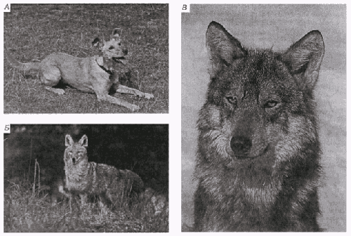 Рис. 2.2. A. Canis famiharis, домашняя собака. Поскольку собаки всех пород успешно скрещиваются друг с другом, их относят к одному и тому же виду. Б. Canis latrans (койот). Этот представитель семейства собак широко распространен в Северной Америке; питается падалью. В. Canis lupus (волк). Широко распространен в Северном полушарии, где его ареал перекрывается с ареалами двух других видов. Известны случаи успешного скрещивания койотов и волков с собаками, причем потомство, появляющееся от этого скрещивания, фертильно. Приведенный пример показывает, как трудно дать точное определение вида. Нередко бывает даже еще труднее точно определить более крупные таксономические группы, такие, например, как род и порядок. Все собачьи относятся к отряду Carnivora (хищные).