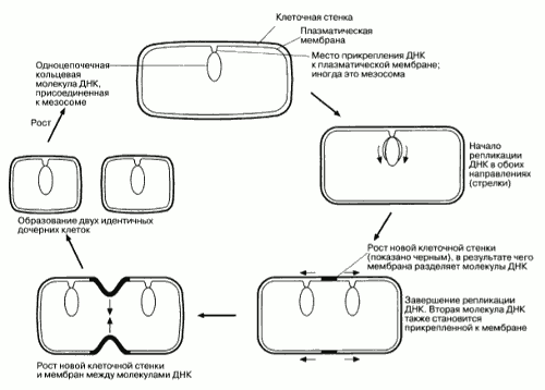 Достигнув определенных размеров, диктуемых соотношением объемов ядра и цитоплазмы, бактерии переходят к бесполому размножению путем простого деления, т.е. путем деления на две идентичные дочерние клетки (рис. 2.11). Клеточному делению предшествует репликация ДНК, причем до тех пор, пока процесс репликации не завершится, мезосомы могут удерживать ДНК в определенном положении (рис. 2.5 и 2.6, В). Мезосомы могут прикрепляться и к новым перегородкам, образующимся между дочерними клетками, участвуя каким-то образом в синтезе материала клеточной стенки. У самых быстрорастущих бактерий деление происходит через каждые 20 мин.