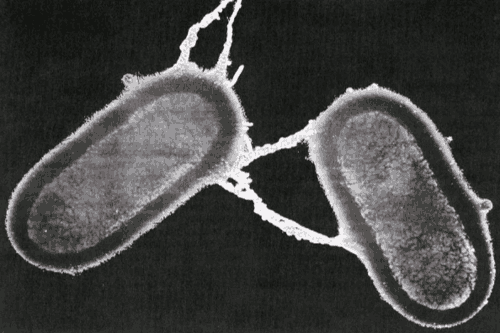 Рис. 2.12. Конъюгация у бактерий. Одна мужская клетка (слева) конъюгирует с двумя «женскими» клетками (х 19 475). Второй «женской» клетки на фотографии не видно, так как она находится сверху за пределами фотографии.