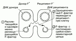 Обратите внимание на то, что донорная клетка сохраняет F-фактор, а реципиентная клетка его приобретает и становится F+. Процесс этот протекает медленно, и поэтому прежде чем перенос F-плазмиды завершится, клетка, бывшая изначально F, успевает реплицироваться один или несколько раз, и в результате в популяции всегда сохраняются F-клетки.