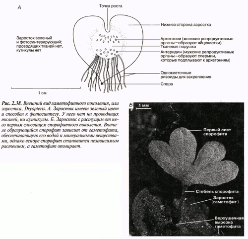 Споры прорастают, давая начало гаметофитному поколению. Гаметофит представляет собой тонкую сердцевидную пластинку клеток диаметром около 1 см (рис. 2.38). Эта пластинка имеет зеленый цвет, способна к фотосинтезу и прикрепляется к почве одноклеточными ризоидами. Поскольку у такого нежного заростка нет кутикулы, он быстро высыхает и, следовательно, может жить только во влажной среде.
