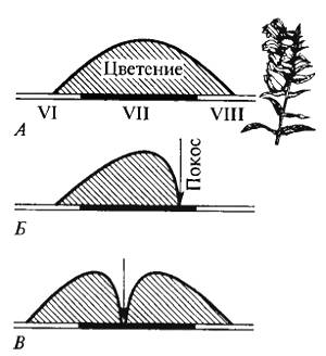 Рис. 9.6. На некошеных лугах большой погремок (Alectorolophus major) цветет и плодоносит в течение всего лета (Л). При регулярном кошении в конце лета (Б) образовалась раса погремка, успевающая принести семена до начала покоса. При более раннем регулярном покосе (В) возникли две расы — ранневесенняя и позднеосенняя. Позднеосенняя раса содержала растения, замедленно развивающиеся до начала покоса, очень низкие, не повреждаемые при косьбе, но затем быстро зацветающие и успевающие дать семена до начала мороза. Пример фенологического полиморфизма (рисунок по данным Н.В. Цингера, 1920)