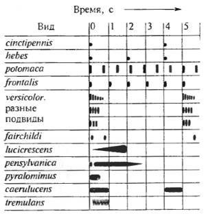Рис. 9.7. Пример эколого-этологической изоляции. Характеристика световых вспышек североамериканских светляков рода Photurus. Высота и длина пятен в таблице указывают на интенсивность и длительность вспышки (из Э. Майра, 1968)
