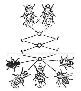 В результате развития генетики полностью подтвердилось предположение Ч. Дарвина о том, что отбор по одному-единственному признаку практически невозможен. В процессе развития каждый ген оказывается связанным с многими признаками. Проявление этого принципа называется полифенией или плейотропией. Примером плейотропного действия наследственного изменения одного гена является действие мутации «полифен» у дрозофилы. Эта мутация одновременно меняет жилкование, форму и расположение крыльев, строение лапок, глаз и еще ряд признаков (рис. 10.2). Теория и практика показала, что единицей отбора всегда оказывается не отдельный признак или свойство, а весь генотип, вся особь в целом. Признак оказывается лишь точкой приложения отбора.