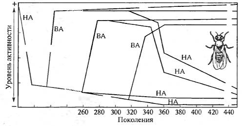 Рис. 10.3. Искусственный отбор в серии близких линий Drosophila melanogaster велся по одному признаку — половой активности самцов (из Л.З. Кайданова, 1986). Направление отбора показано на рисунке стрелкой: НА — низкоактивная линия; ВА — высокоактивная линия. В результате отбора все линии ВА отличались от линии НА по многим признакам, по которым специального отбора не было: частоте встреч аномального строения брюшка, уровню двигательной активности, плодовитости самок и фертильности самцов, активности ювенильного гормона, концентрации мутаций, повышающих и понижающих жизнеспособность, и др. Эксперимент, охвативший 440 поколений, подтвердил, что отбор по одному признаку всегда влечет за собой шлейф автоматически соотбираемых признаков