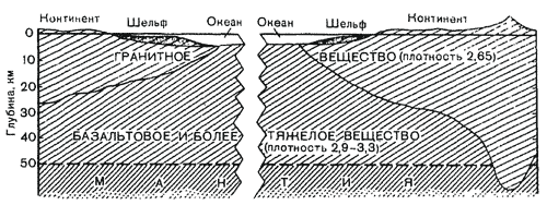 Рис. 2. Континенты, в том числе и их шельфы, легче, чем подстилающий их базальтовый материал, и поэтому они плавают на базальтах. На рисунке не показана большая масть пространства океана (заключенная между зигзагообразными линиями), где легкие породы отсутствуют.