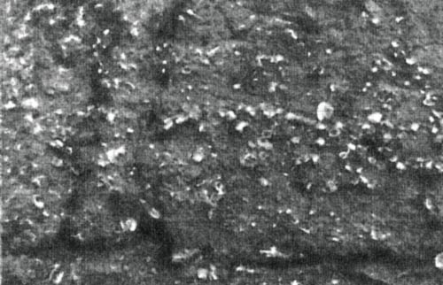 Фото 22. Слоистый ил, содержащий ископаемые моллюски различных видов. Справа от середины снимка помещен карандаш длиной 12,5 сантиметров. Бассейн реки Тибр ниже Рима.