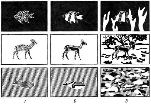 Рис. 11.2. Схема действия расчленяющей окраски: А — сплошная окраска, Б — расчленяющая; В — животное с расчленяющей окраской на соответствующем фоне малозаметно (из X. Котта, 1950)