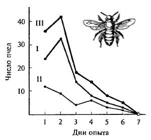 Рис. 11.5. Динамика поедания пчел 18 жабами (Bufo bufo) в двух экспериментах (рисунок по данным X. Котта, 1950). Перед началом каждого эксперимента животные неделю голодали. Между I и II экспериментами прошло две недели. III — суммарные данные по двум экспериментам. Видно, что к 7-му дню в каждом эксперименте жабы выучились избегать поедания пчел. Это нежелание иметь дело с пчелами сохранялось у некоторых жаб на две недели