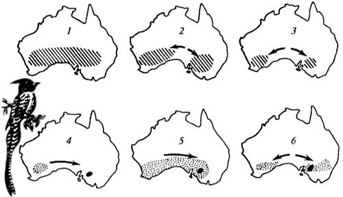 Видообразование в группе австралийских мухоловок. В настоящее время в Австралии распространены два близких вида мухоловок рода Pachycephala (P. rufogularis и P. inornata). В результате тщательного анализа палеогеографии и палеоклиматологии удалось восстановить возможный путь образования такой странной на первый взгляд ситуации, когда один из близких видов обитает лишь на небольшом пространстве, занимаемом другим видом (рис. 13.3). Вначале существовал лишь один предковый вид, имевший широкий ареал (рис. 13.3, 1). В связи с наступлением засушливого периода, изменениями в растительности и смещениями дождевых зон возникла и развилась значительная изоляция между западной и восточной частями видового населения (рис. 13.3, 2, 3). Существуя в несколько иных условиях и при отсутствии нивелировок достигаемых различий (при отсутствии скрещивания), две формы приобрели видовую самостоятельность (рис. 13.3, 4). Затем вновь получила распространение сравнительно влаголюбивая растительность и западный вид смог расселиться на восток, где он встретился с родственным видом, приобретшим какие-то специфические особенности. Различия между этими прежде генетически близкими формами оказались настолько значительны, что определили возможность их самостоятельного существования без скрещивания. В сравнительно недавнее время в результате нового иссушения климата вновь возникла изоляция между западной и восточной частями населения одного из видов (рис. 13.3, 5).