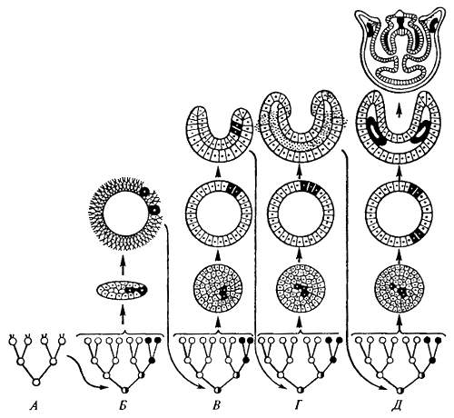 Рис. 14.1. Схема последовательного усложнения онтогенеза многоклеточных в процессе эволюции. А — размножение свободно живущих одноклеточных; Б — онтогенез колонии одноклеточных типа Volvox [происходит дифференцировка клеток на половые (черным) и соматические]; В — онтогенез многоклеточного организма типа гидры (прибавляются стадии бластулы и гаструлы); Г — онтогенез первичного двустороннесимметричного животного (прибавляется мезодерма); Д — онтогенез высшего двустороннесимметричного животного (по А.Н. Северцову, 1935)