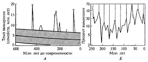 Рис. 15.14. Темп вымирания (число вымерших семейств за миллионы лет) для 3500 семейств морских животных и растений. Видно, что средний темп вымирания (А — сплошная линия в центре) уменьшается за последние 600 млн лет. Пиками обозначены массовые вымирания. Б — более подробные данные за последние 250 млн лет. Обнаруживается периодичность вымирания через 26 млн лет (по Д. Раупу и Дж. Сепкоски, 1984). Катастрофичность вымирания искусственно подчеркнута тем, что все вымирания, происходившие в пределах яруса геохронологической шкалы, отнесены к его концу (из Л.П. Татаринова, 1987)