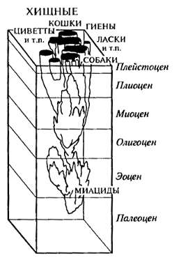 Рис. 15.15. Эволюционное древо хищных млекопитающих. Возникновение из единого ствола разнообразных семейств современных хищных: собачьих, медвежьих, енотовых, куньих, виверровых, гиеновых и кошачьих иллюстрирует правило происхождения от неспециализированных предков и правило адаптивной радиации (из А. Кейна, 1958). Пример трехмерного изображения филогенетического древа