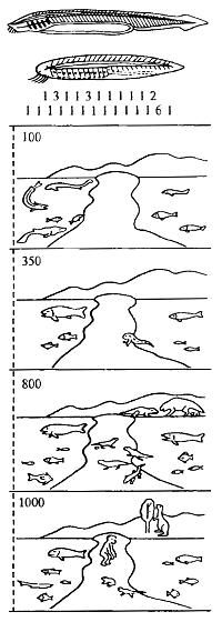 Рис. 15.17. Результаты моделирования хода эволюционного процесса (по Б.М. Медникову, 1979). После 100-кратного отбора вариантов от прототипа хордовых, похожего на ланцетника (наверху), в море и пресных водах «появились» разнообразные рыбообразные с челюстями и парными плавниками. Через 350 млн лет на сушу «вышло» первое существо. Через 1 млрд лет появился двуногий хищник с освобожденными передними конечностями. При повторных экспериментах на сушу «выходили» существа с тремя парами плавников, конечным результатом в этом случае были наземные шестиногие с освобожденными передними конечностями