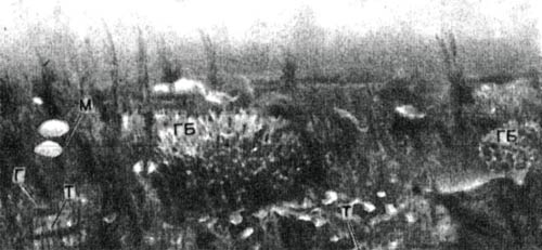 Фото 29. Реконструкция облика дна кембрийского моря. Г - голотурии, М - медузы, ГБ - губки, Т - трилобиты. Размер трилобитов - 5-7,5 см.