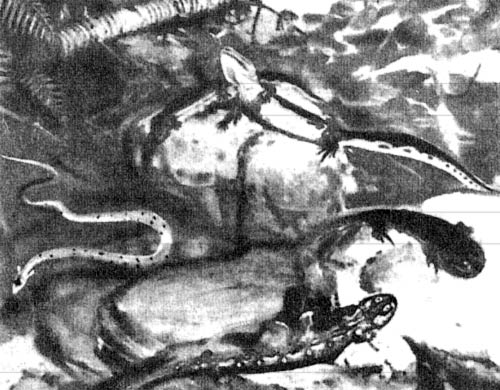 Выход амфибий на сушу. В предыдущей главе мы остановились на том, что первые амфибии, только что развившиеся из кистеперых рыб, которые выползли на сушу, стали знакомиться с сушей, которую им предстояло заселить. Конечно, обзор у них был еще небольшой, так как на своих слабых и все еще очень коротких ногах они были вынуждены ползать по земле, почти как рыбы, оказавшиеся на берегу. Амфибии могли передвигаться только медленно и неуклюже, но по крайней мере на суше у них не было врагов опаснее насекомых, которые, как можно предполагать, их практически не тревожили.