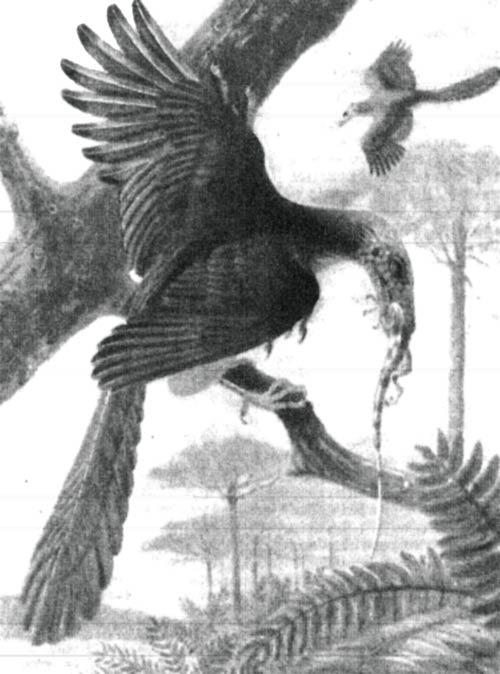Фото 47. Археоптерикс (Archaeopteryx), древнейшая известная нам птица, сидит на ветке хвойного дерева, собираясь съесть пойманную ящерицу. На переднем плане справа - цикадовые растения; сзади - хвойные деревья и еще одна такая же птица. Реконструкция.