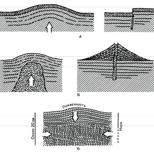 Рисунок 3Б показывает два обычных способа воздействия на земную поверхность расплавленных пород, движущихся снизу вверх. В левой части изображена масса расплавленной породы, которая медленно поднялась из глубин земной коры, проделав многокилометровый путь; она деформировала вышележащие пласты, но остыла и затвердела, не достигнув земной поверхности. Справа показано, как расплавленная масса под давлением поднималась по трубкообразному каналу и разливалась по поверхности, образовав последовательность слоев лавы, каждый из которых затвердевал раньше, чем перекрывался следующим. При этом существовавшие ранее породы не были деформированы, а было создано новое конусообразное сооружение – слоистый вулканический конус (стратовулкан). Некоторые из таких конусов превышают 6 километров и имеют крутые склоны. Особенно много их на морском дне.
