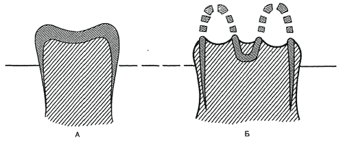 Рис. 59. Коренные зубы млекопитающих. А. Низкий коренной зуб нетравоядного млекопитающего. Б. Коренной зуб травоядного млекопитающего, более высокий и имеющий складчатую структуру; более мягкий материал быстрее истирается, а твердая эмаль (на рисунке показана частой штриховкой) образует небольшие выступы.