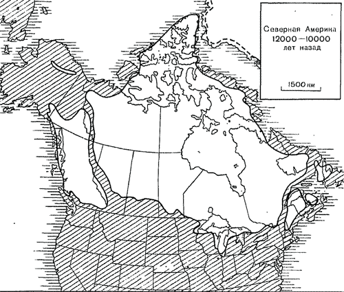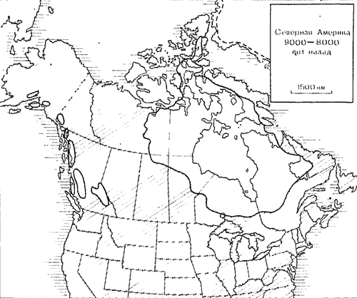 Рис. 63. Схема таяния ледников Северной Америки в конце последней ледниковой эпохи (главным образом по данным Геологической службы Канады). В. Около 9000 лет назад.